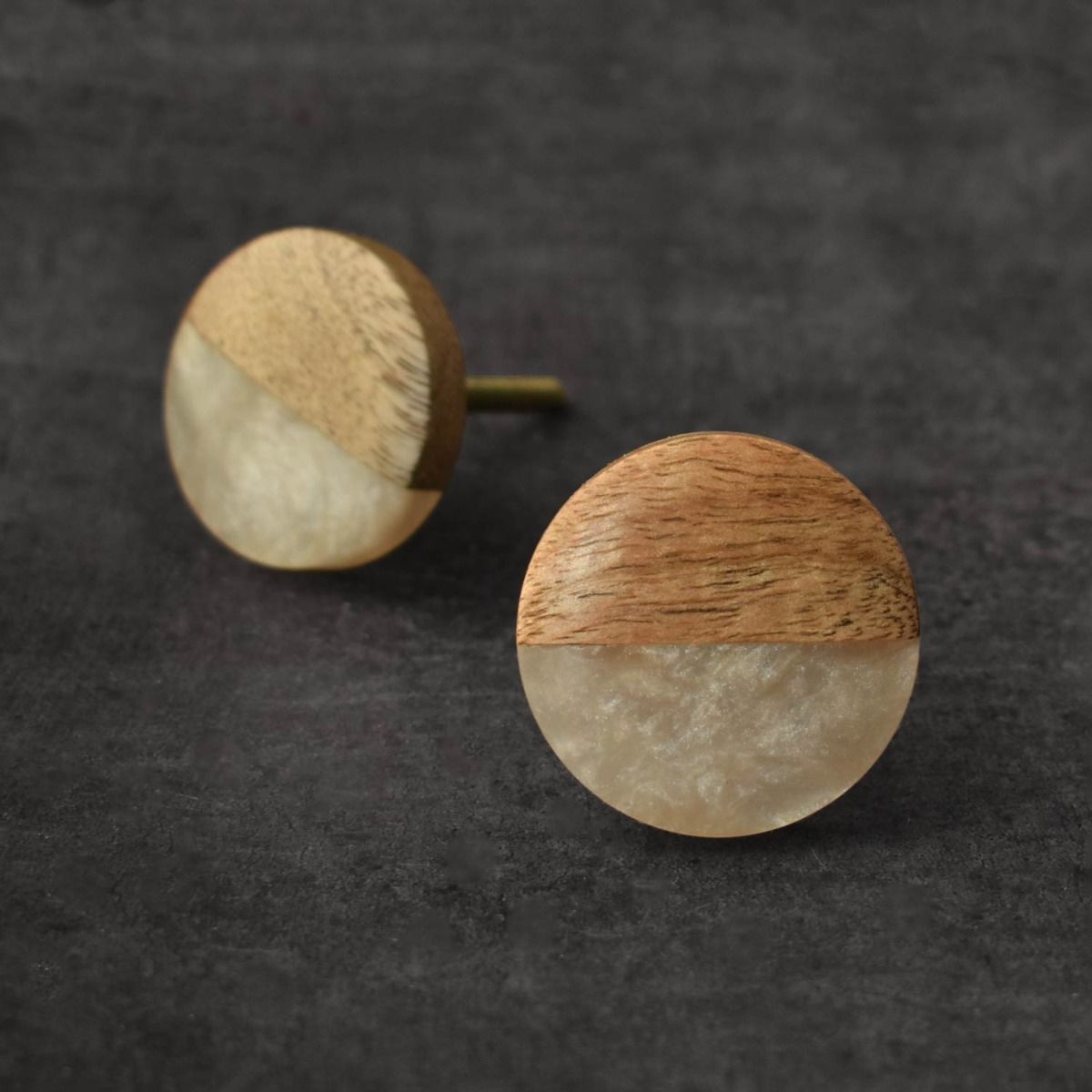 Puxador redondo bicolor: resina pérola e madeira.